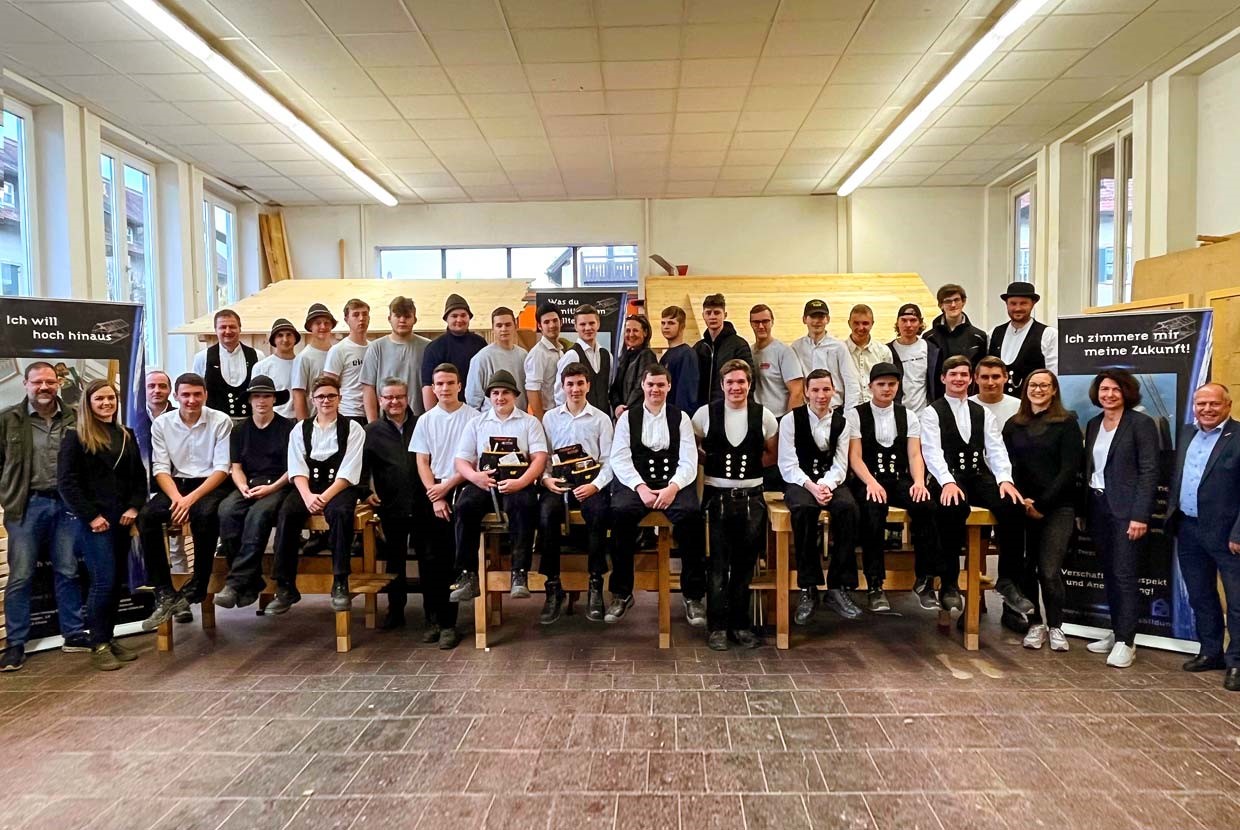 „Wenn ihr gut seid, habt ihr als Zimmerer beste zukunftssichere Perspektiven, weil Fachkräfte dringend gebraucht werden, und gebaut wird immer“, betonte Zimmerer-Innungsobermeister Tobias Weber. Er freue sich, dass bei den Zimmerern die traditionelle Handwerkskluft hoch im Kurs steht, so Weber. Kreishandwerksmeister Georg Braun lobte die hervorragende Zusammenarbeit von Berufsschule, Handwerkskammer und Innungsbetrieben bei der Ausbildung, im Prüfungswesen und bei der Werbung für die Bau- und Ausbauberufe. Er dankte dem Sachaufwandsträger, den Fachkräften der Berufsschule, den Innungen und den Betrieben, die ausbilden und die Basis für einen ausreichenden Fachkräftenachwuchs schaffen.